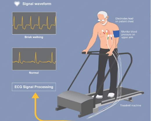 You walk on a treadmill while connected to ECG leads. Speed and incline gradually increase. This helps reveal hidden blockages when your heart works harder.