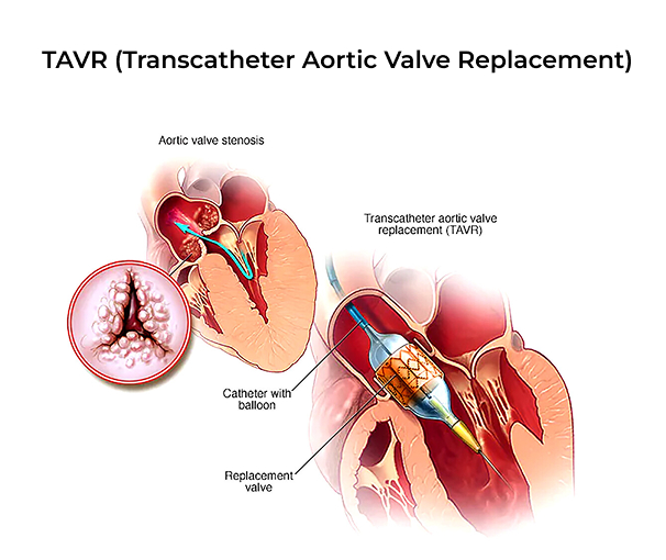 A new valve is delivered via artery to replace the diseased aortic valve. Done in select elderly/high-risk patients with a team approach.